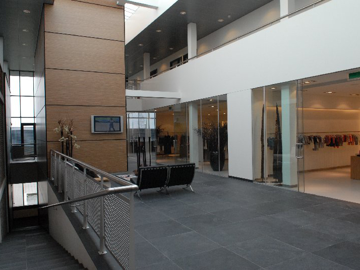 De bedrijfshal en kantoor omvatten elkaar. Er ontstaat een dynamiek door de "overpakkende" gevouwen vormen. Het hart van het geheel wordt gevormd door het atrium waar tevens de showrooms zijn gesitueerd, als ware het een winkelstraat.